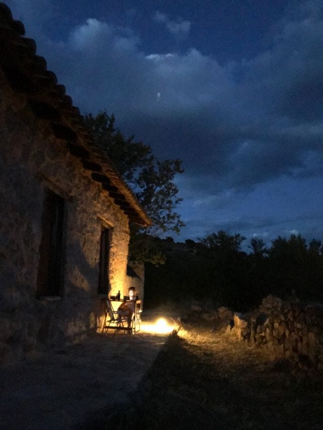 Nos hemos salido a la fresca. Las cigarras han pasado el turno a los grillos, que trabajan con el ímpetu del inicio de jornada. Empieza a refrescar y no sé si es mejor ponerme el jersey o servirme un vinito.