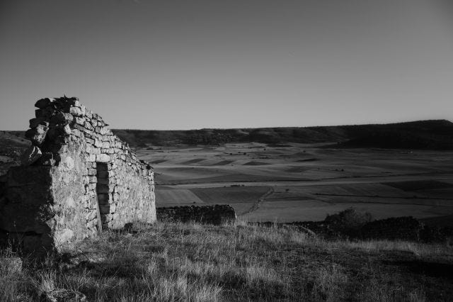 El sábado necesitaba desconectar y me marché a ver la obra del refugio, que aunque va viento en popa, esa semana no había avanzado lo esperado. En vista de que no había mucho que fotografiar ahí, decidí sentarme en un bloque de hormigón a terminar de leer un libro y luego, cuando empezó a dorarse la luz, me di un paseo con la cámara. De entre todas las fotos que hice, me gusta esta, que resume sin color, las texturas y luz del valle que se abre al sur del refugio: